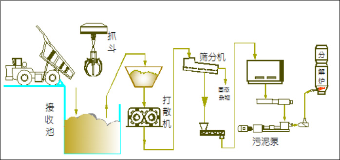 半固態(tài)廢物配伍后,卸入半固態(tài)廢物接收坑,再由抓斗抓入打散機(jī)進(jìn)行打散,打散后的物料經(jīng)篩分機(jī)將其中的固態(tài)雜物和大塊物料篩除,少量篩上物料另行處置。篩下物料(漿狀物料呈污泥狀)由螺旋輸送機(jī)輸送至污泥倉(cāng)。倉(cāng)內(nèi)漿狀物料由膏體泵輸送至窯尾高溫焚燒,系統(tǒng)配置除雜器,入窯口配置污泥噴槍。