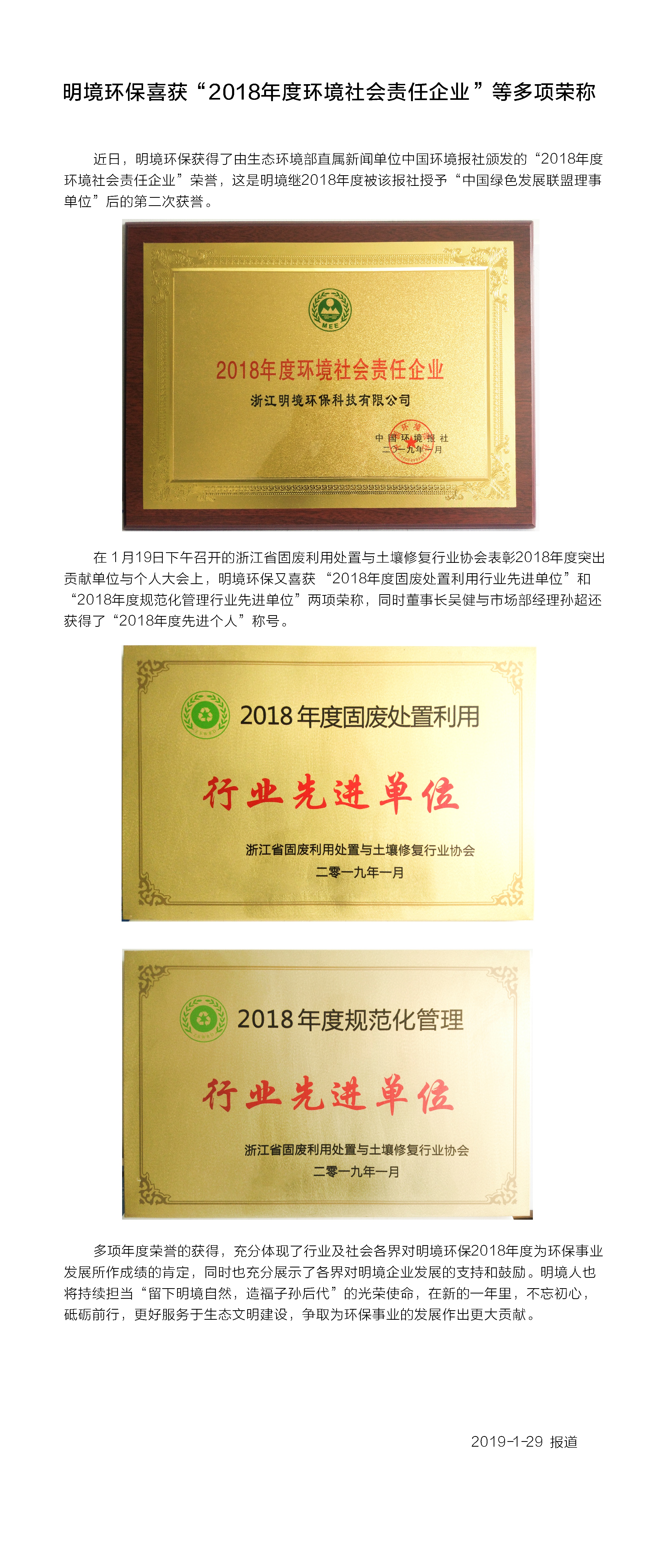 明境環(huán)保喜獲“2018年度環(huán)境社會(huì)責(zé)任企業(yè)”等多項(xiàng)榮稱